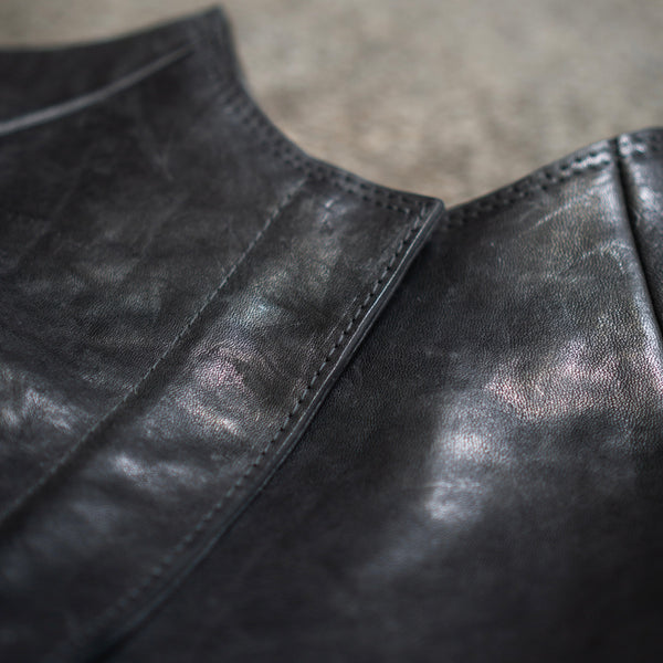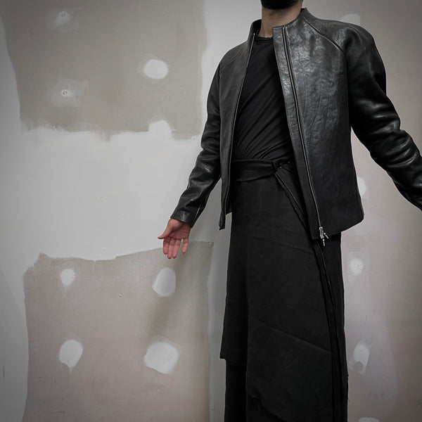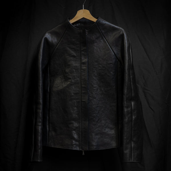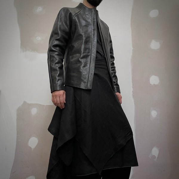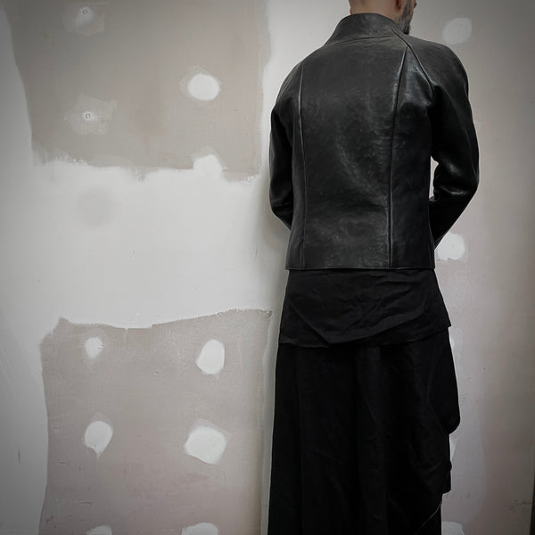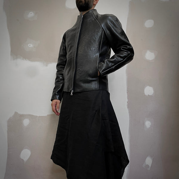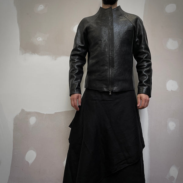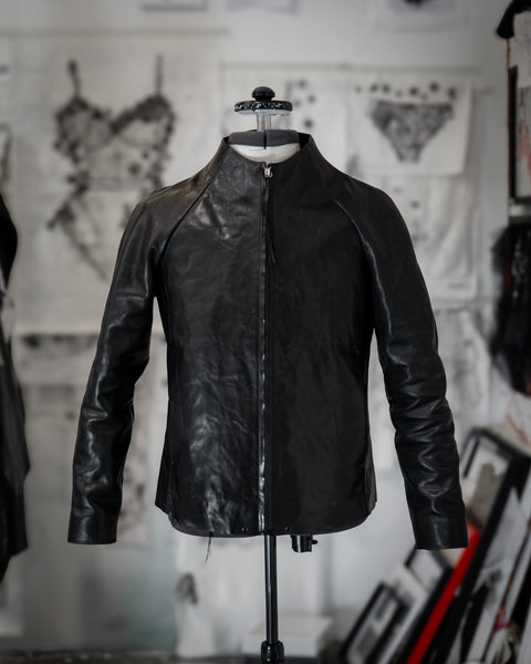 J05 leather jacket featuring raglan sleeves, in-seam pockets, a zip cover and the neckline of the jacket sweeps up to form a collar. All edges have been left raw and the seams have been hammered flat.